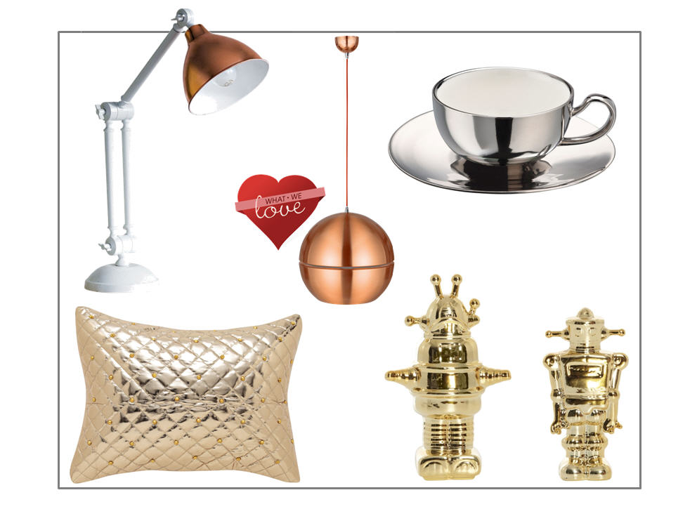 Recreate the Metallic Madness look in your home with this stunning range of homewares (clockwise from left): ‘Kopa’ Table Lamp, ‘Comet’ Pendant, ‘Society’ Cup and Saucer, ‘Will’ Robot, ‘Elite’ Quilted Cushion